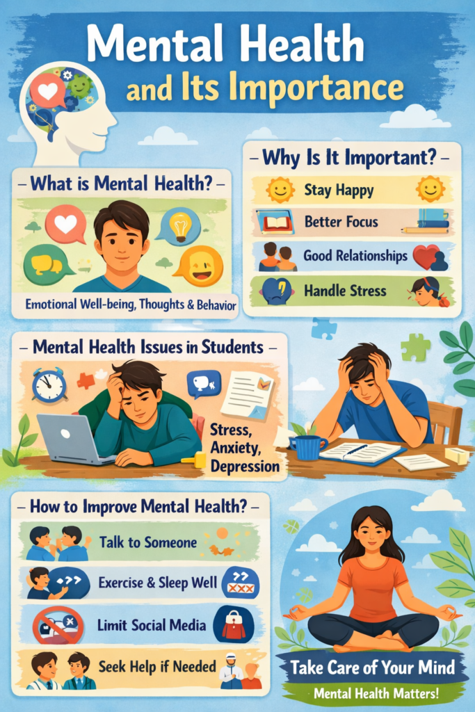 Mental health refers to the well-being of our mind and emotions. In today’s time, mental health has become a very important topic, especially for students and young people. Due to stress, tension, and constant pressure, many individuals face mental health challenges, but they often hesitate to talk about them openly.